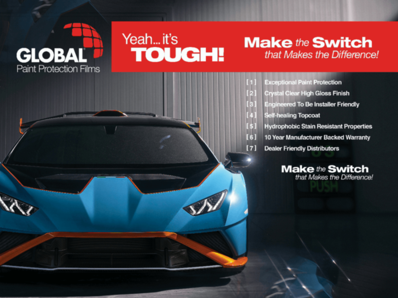 Global Paint Protection Films are in a class apart. They are the result of a single-source, vertically integrated manufacturing process. Global PPF is super gloss, has hydrophobic clear coat, perfect surface without the trace of orange skin effect, is soft to stretch and self heals at room temperature in seconds.