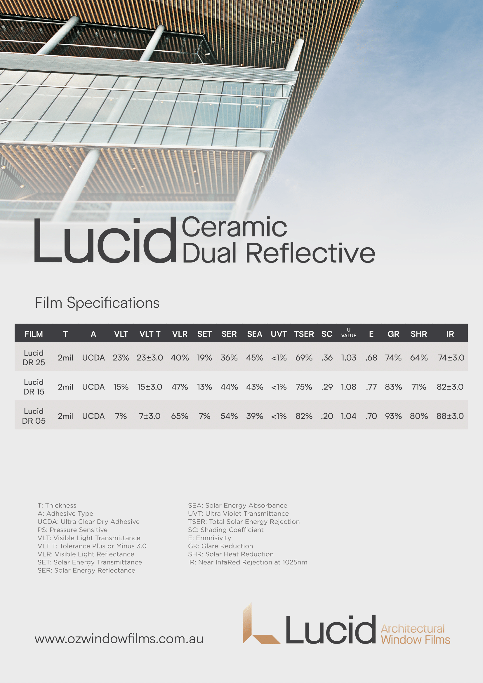 Lucid Ceramic Dual Reflective has a sleek reflective appearance on the exterior that will provide privacy from the outside and a clear uninterrupted view from the inside while reducing the maximum heat, Infra Red and Ultra Violet rays that would put extra load on air conditioning and cause costly fading of interior furnishings and floor coverings.